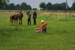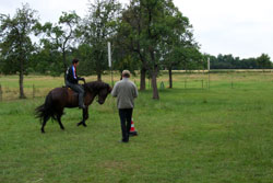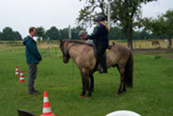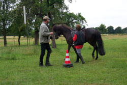 Für junge Pferde, wie hier Tindra, war dann doch einiges neu. Aber sie arbeitet sehr schön mit und ihre Reiterin Marion konnte ihr Pferd mal vom Boden aus mit Reynir beobachten. |