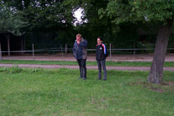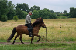 Reynir mit Tina und Saigon bei der Biegearbeit. Alle Pferde mussten zeigen, ob sie sich im Hals problemlos biegen lassen. Gab es Probleme, wurden sie behoben. Da wir alle schon bei seinem Sohn Gunnar eine Menge gelernt hatten, waren aber solche Übungen nicht mehr neu für die Pferde und Reiter. Und Reynir konnte schnell weiter gehen in seinem Lehrprogramm. |