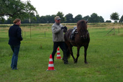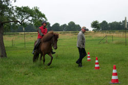 Um gut gebogene Linien, ging es bei der Arbeit um die Kegel. Hier läuft Reynir mit Gleichschritt mit Sæta eine gut geschwungene Schlangenlinie um die Kegel herum. Reitlehrer, Schülerin Ute und Sæta sind voll konzentriert. |