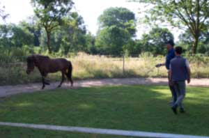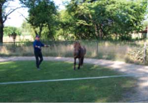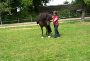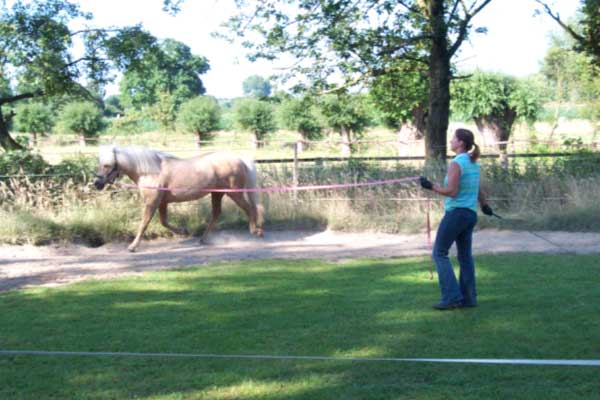Zur Prüfung von Level 2 traten dann noch 4 Teilnehmerinnen an. Ute hatte ihr selbst gestecktes Ziel Level 1, erreicht und wollte keine weiteren Prüfungen mehr machen. Bei der Theorie rauchten die Köpfe und Reynir hatte abends eine Menge Lesestoff zu bewerten. Bei der praktischen Prüfung wurde es auch immer schwieriger, aber trotzdem haben alle es geschafft und waren sehr aufgeregt und zufrieden am Abend. Der Sonntag hatte dann volles Programm. Es wurde geübt und dann zwischendurch die theoretische Prüfung für Level 3 geschrieben. Dann die praktische Prüfung für Level 3, erst im Roundpen mit dem Longieren.